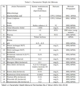 Standar baku mutu kesehatan lingkungan media Air Minum dituangkan dalam parameter yang menjadi acuan Air Minum aman. Parameter yang dimaksud meliputi parameter fisik, parameter mikrobiologi parameter Kimia serta radioaktif. Dalam Peraturan Menteri ini, parameter dibagi menjadi parameter utama dan parameter khusus, Penetapan tambahan parameter khusus menjadi tanggung jawab pemerintah daerah melalul kajian ilmiah.
